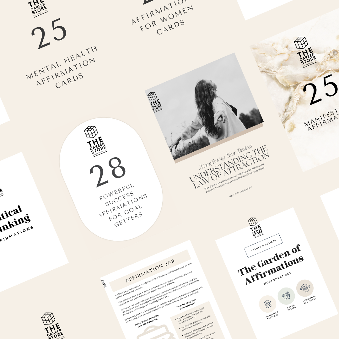 The 'Affirmations Bundle' combines a variety of positive reinforcement tools, including '25 Manifestation Affirmation Cards,' '28 Powerful Success Affirmation Cards for Goal Getters,' 'Affirmation Cards,' 'Affirmation for Women Cards,' 'Affirmation Jar,' 'Critical Thinking Affirmation Cards,' 'Mental Health Affirmation Cards,' 'The Garden of Affirmations Worksheet,' and the 'Understanding the Law of Attraction eBook.' This bundle is an arsenal for anyone seeking to harness the power of positive thought to transform their life, achieve their goals, and enhance their mental well-being.